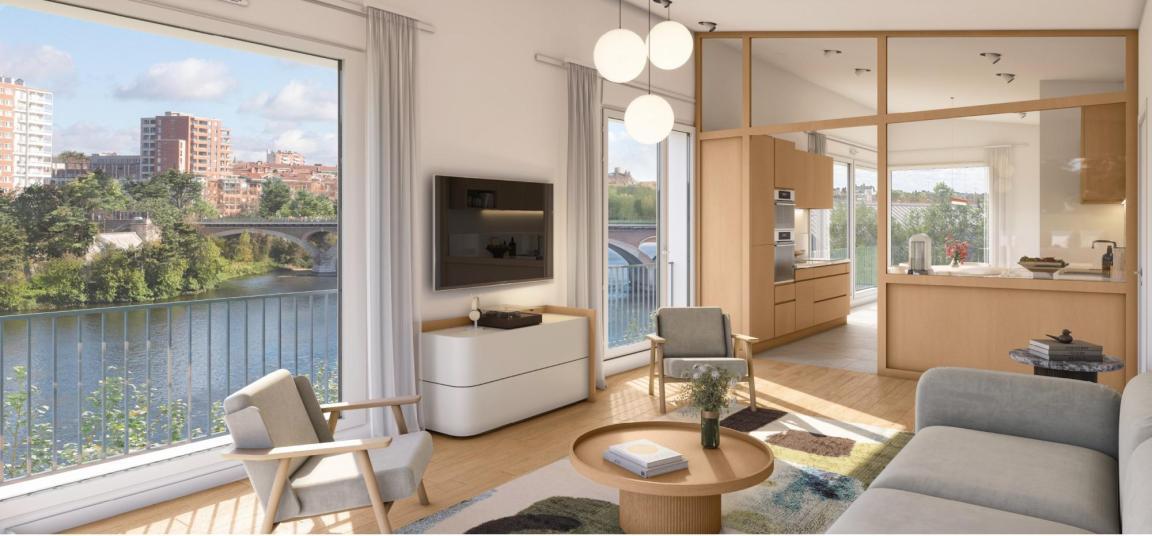 Les intérieurs ont été pensés comme des espaces lumineux, généreux et confortables. De grandes baies vitrées prolongent les pièces vers des terrasses ou des balcons spacieux, certains devenant de véritables belvédères privés offrant une perspective unique sur les monuments de la Ville rose. Les prestations haut de gamme viennent souligner cette exigence de confort : structure en béton armé, finitions soignées, volumes optimisés, matériaux nobles.